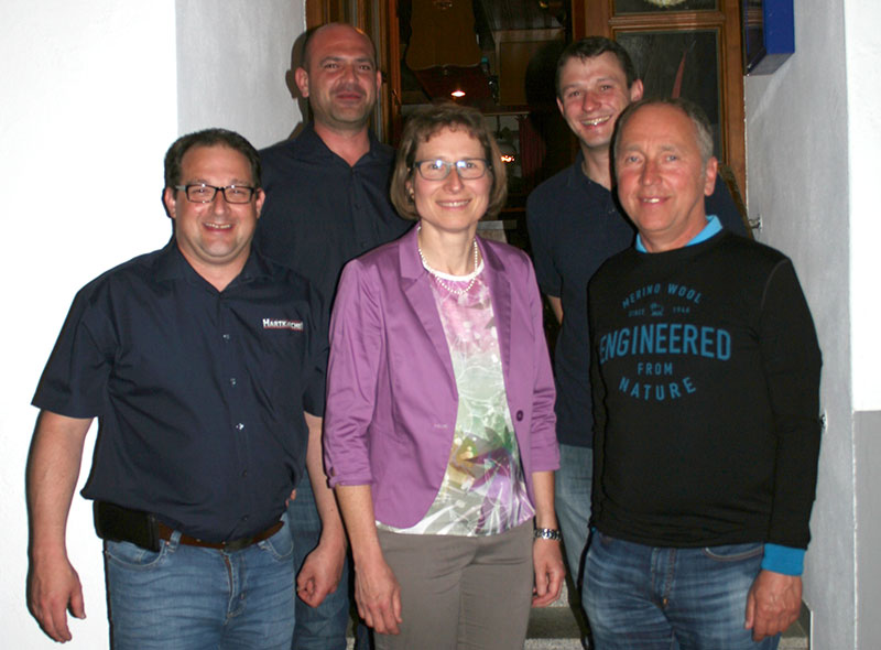 Der Gewinner der Maibaumverlosung: Vorsitzender Markus Maidl (v.l.), 2. Kommandant Markus Fraudorfer, Fahnenmutter Beate Kirschner-Schraufnagl, 1. Kommandant Christian Schmerbeck, Maibaumgewinner Erich Hofbauer.