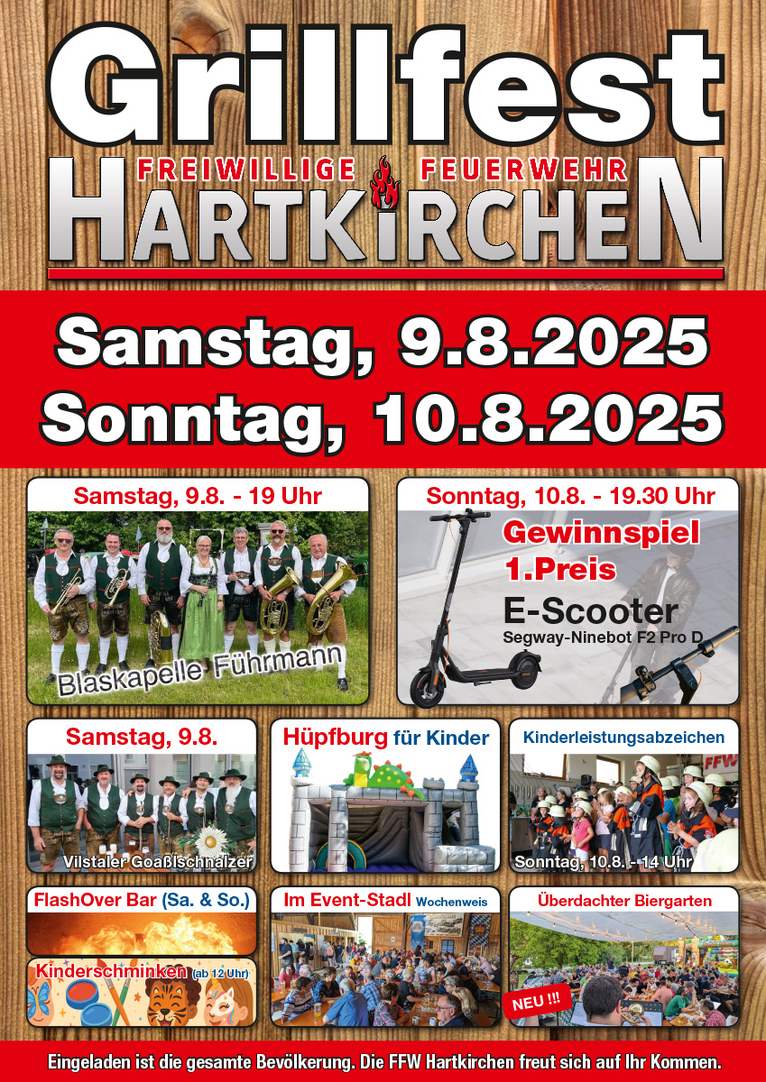 Das Grillfest der FFW Hartkirchen am Samstag, 9. August, und Sonntag, 10. August, findet heuer wieder im Event-Stadl in Wochenweis statt. Beginn ist am Samstagabend, 9.August ab 18 Uhr, mit