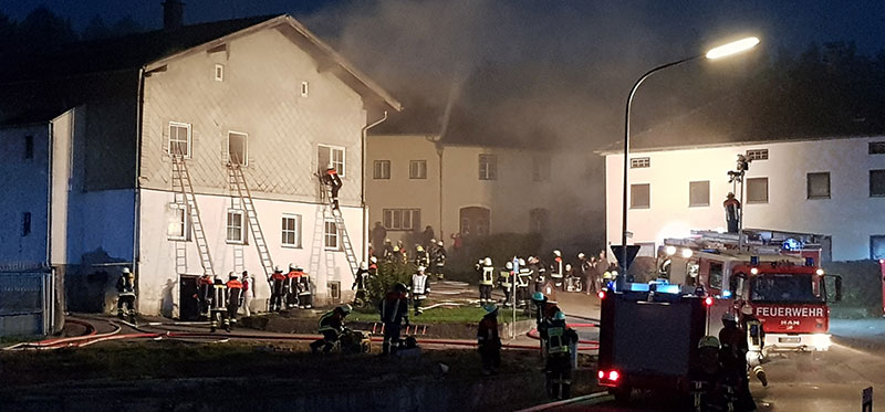 Nachdem wenige Minuten nach der Alarmierung auch die Wehren Eichendorf, Adldorf, Reichstorf, Dornach, Perbing und Kröhstorf am Einsatzort eintrafen, wurde im Innenangriff die Personenrettung und Brandbekämpfung durch Atemschutzträger eingeleitet. Die Erstversorgung der befreiten Personen übernahm dann der First Responder.