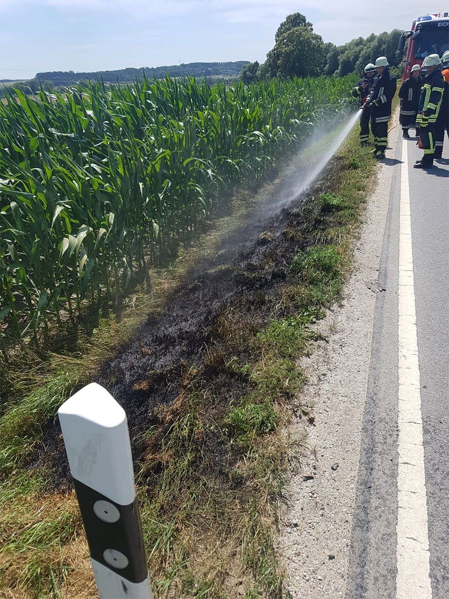 Am Samstag Nachmittag wurde die FFW Hartkirchen zum einem Einsatz auf der Staatsstraße zwischen Pitzling und Eichendorf alamiert. Der Fahrbahnrand hatte auf ca. einer Länge von 6-8 Meter Feuer gefangen. Ursache wahrscheinlich eine weggeworfene Zigarette. Die Feuerwehr Eichendorf konnte den Brand mit dem Schnellangriff Ihres neuen HLF schnell löschen.
