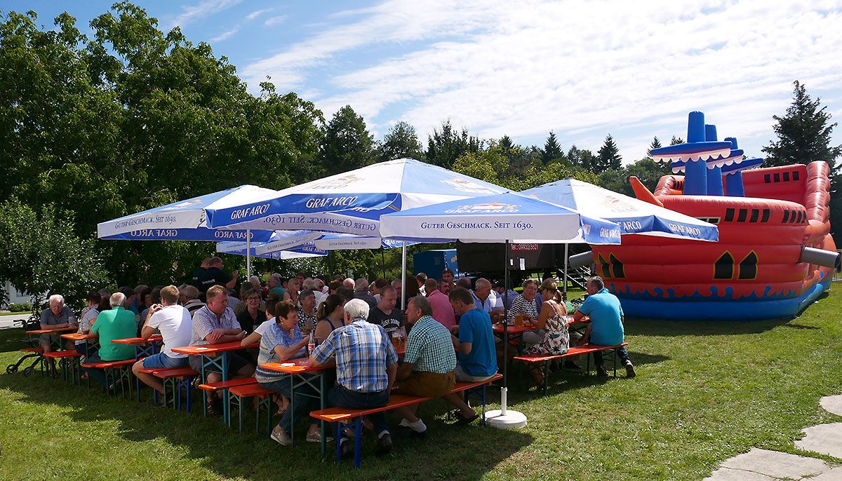Die Wehrmänner hatten sowohl im Party-Stadl als auch im großen Biergarten alle Hände voll zu tun, um dem riesigen Ansturm der Gäste gerecht werden zu können. Begonnen hatte das Fest am Samstagabend. Vorsitzender Markus Maidl und Kommandant Christian Schmerbeck freuten sich, unter den zahlreichen Gästen auch Kreisbrandmeister Max Schraufnagl, 3. Bürgermeister Werner Straubinger, Markt- und Kreisräte sowie viele Abordnungen der Nachbarvereine begrüßen zu können. Für das leibliche Wohl war an beiden Tagen mit Schweinsbraten, Grillspezialitäten, Brotzeiten sowie Kaffee und Kuchen bestens gesorgt. Für die kleinen Besucher gab es eine besondere Überraschung, eine Hüpfburg in Form eines großen Schiffes, in dem die Mädchen und Buben ausgelassen toben konnten.