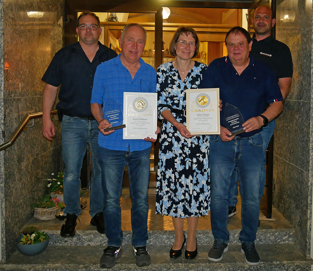 Für seine langjährige Mitgliedschaft in der Vorstandschaft und zahlreicher Verdienste bei der Feuerwehr Hartkirchen wurde Alfons Flieger geehrt. Ein herzlicher Dank galt auch Erich Hofbauer, er war 12 Jahre Ausschussmitglied.