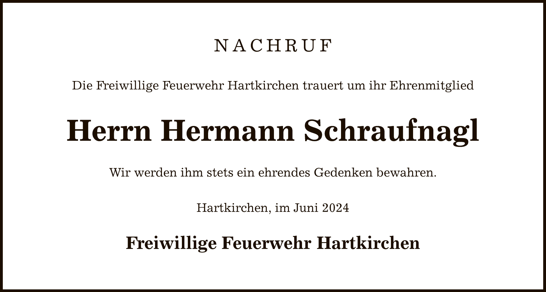 Am Freitag, den 28.6.2024 musste die Feuerwehr Hartkirchen sich von Ihrem Ehrenmitglied Hermann Schraufnagl aus Wochenweis verabschieden. Er ist am 21.6. im Kreise seiner Lieben verstorben.