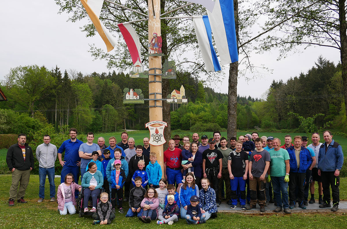 Hoch aufgerichtet steht der Maibaum am Feuerwehrgerätehaus in Hartkirchen/Wochenweis und grüßt weit in die Gemeinde. Am Mittwoch versammelten sich Helfer der Feuerwehr am frühen Morgen, um den von Kreisbrandmeister Max Schraufnagl gestifteten Maibaum einzuholen. Anschließend wurde der 30 Meter Stamm geschmückt und verziert, der dann zum Kommando von Karl Apfelbeck mit Muskelkraft und Schwaiberln in die Senkrechte gehievt wurde.