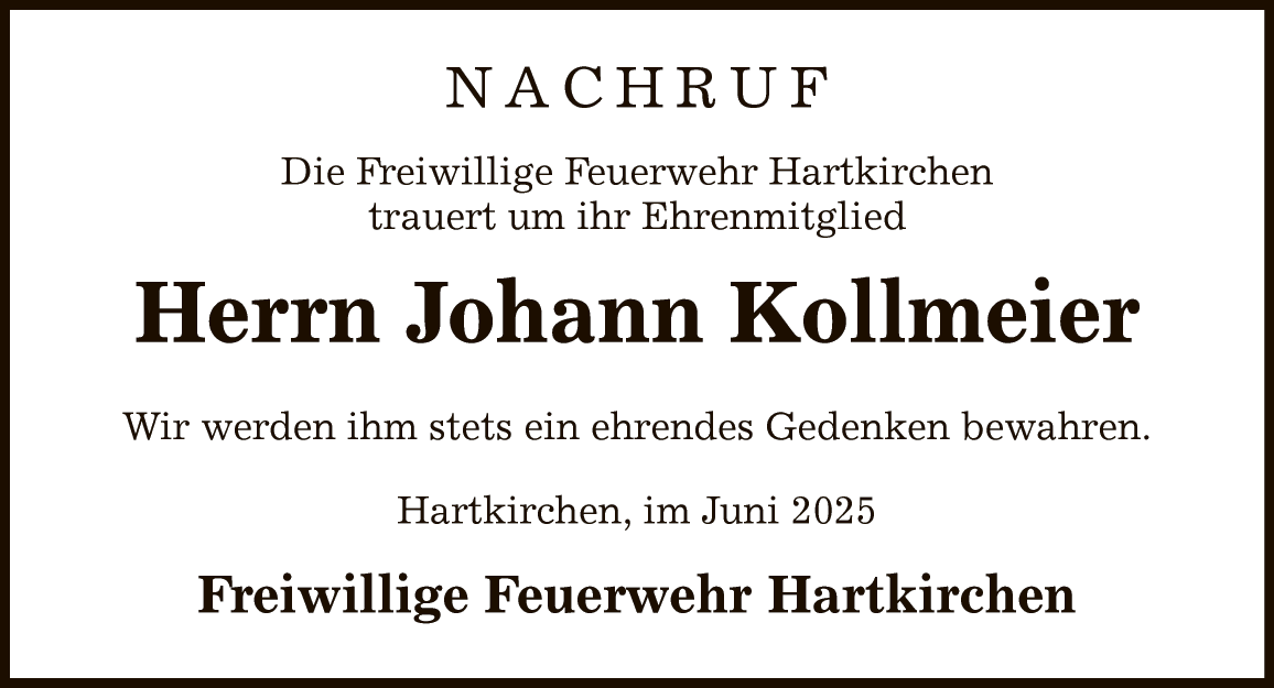 Am Freitag, den 6.6.2025 musste die Feuerwehr Hartkirchen sich von Ihrem Ehrenmitglied Johann Kollmeier aus Wochenweis verabschieden. Er ist am 2.6. im Kreise seiner Lieben verstorben.